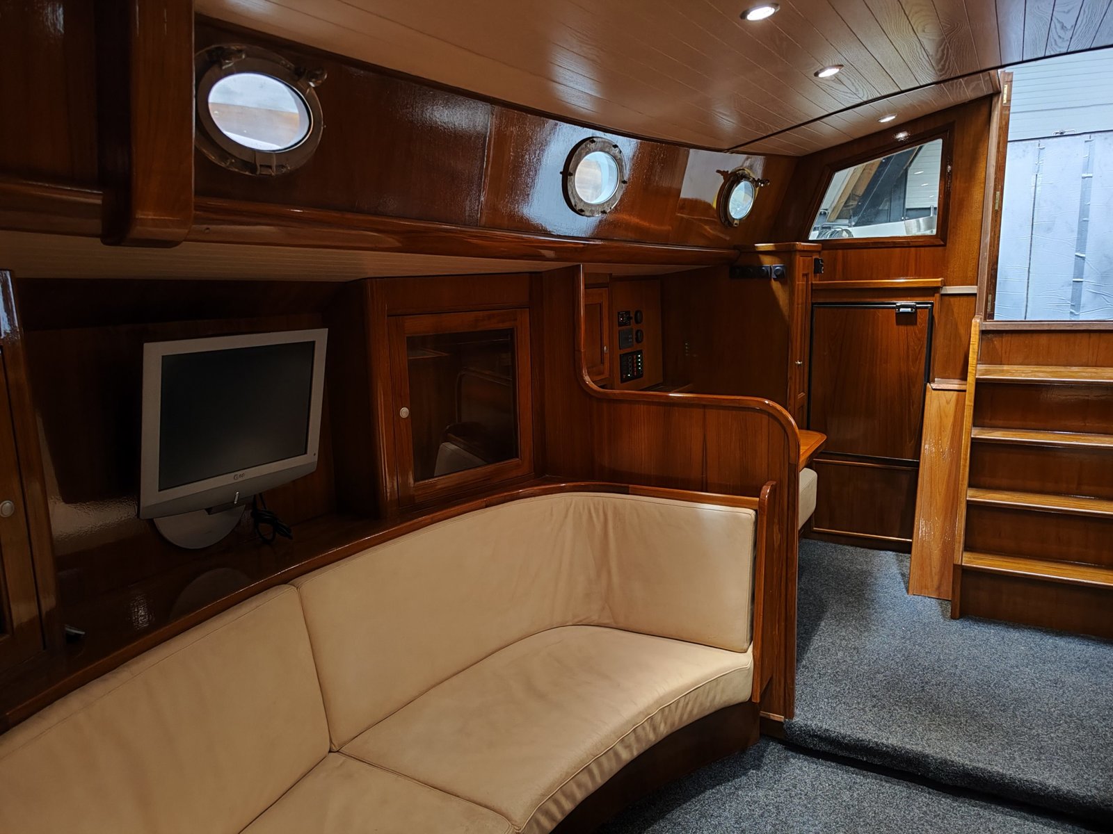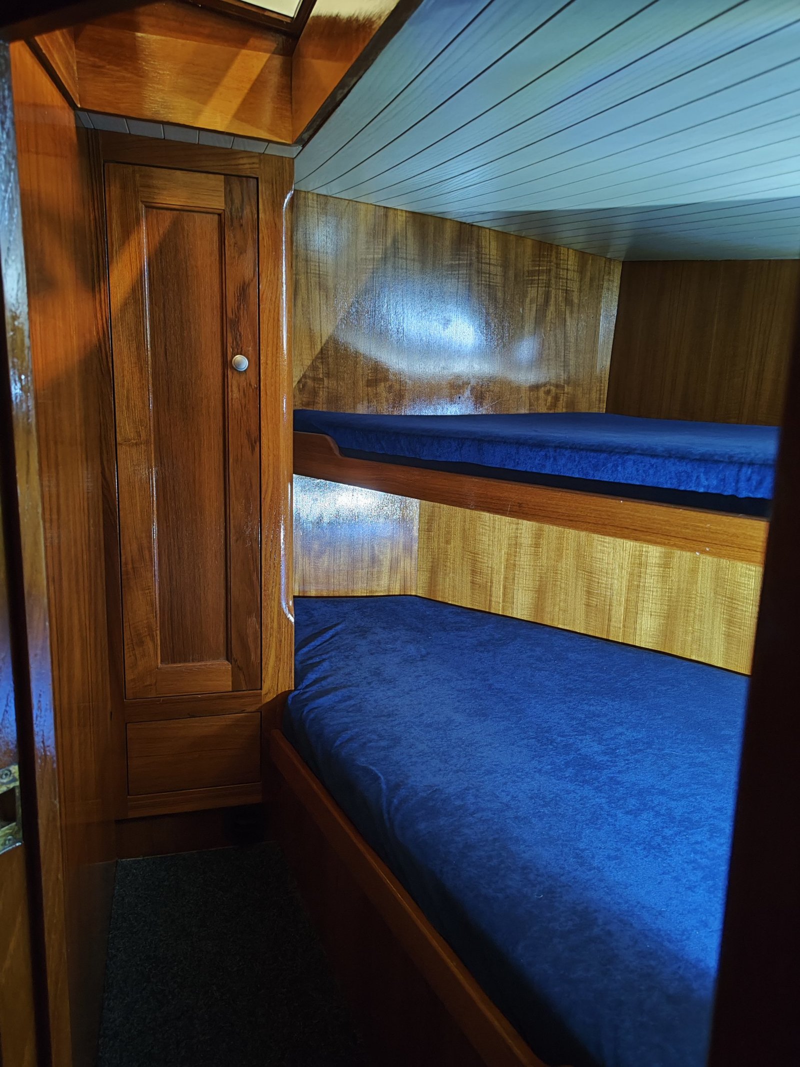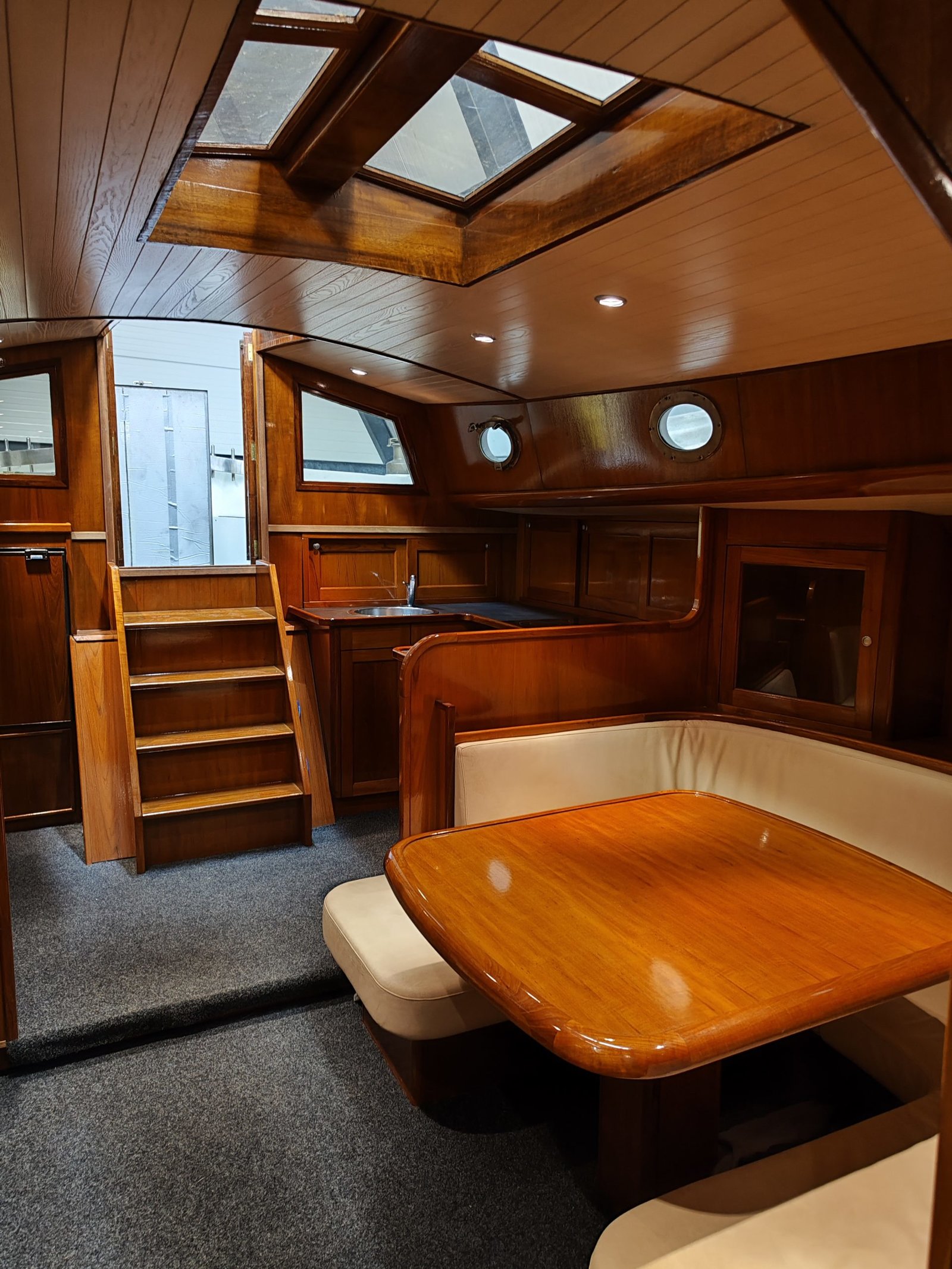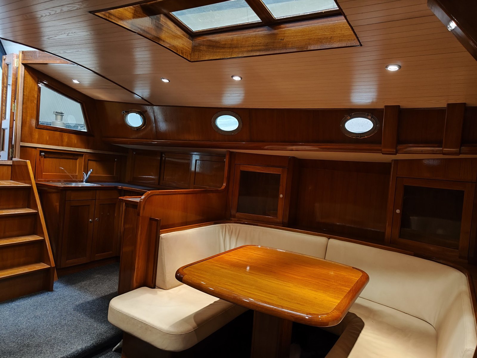 Gezellig interieur met slaapgelegenheid voor max. 6-8 personen, waarvan 4 a 5 slaapplaatsen in de 2 voorste hutten ( eenpersoonsbedden), een dubbelbed in de eigenaarshut. 2 extra bedden te creeren in de zithoek in het salon. De ruime kombuis ligt bij de neergang met ceramisch fornuis en koelkast. Luxe, grote U-bank met tafel.