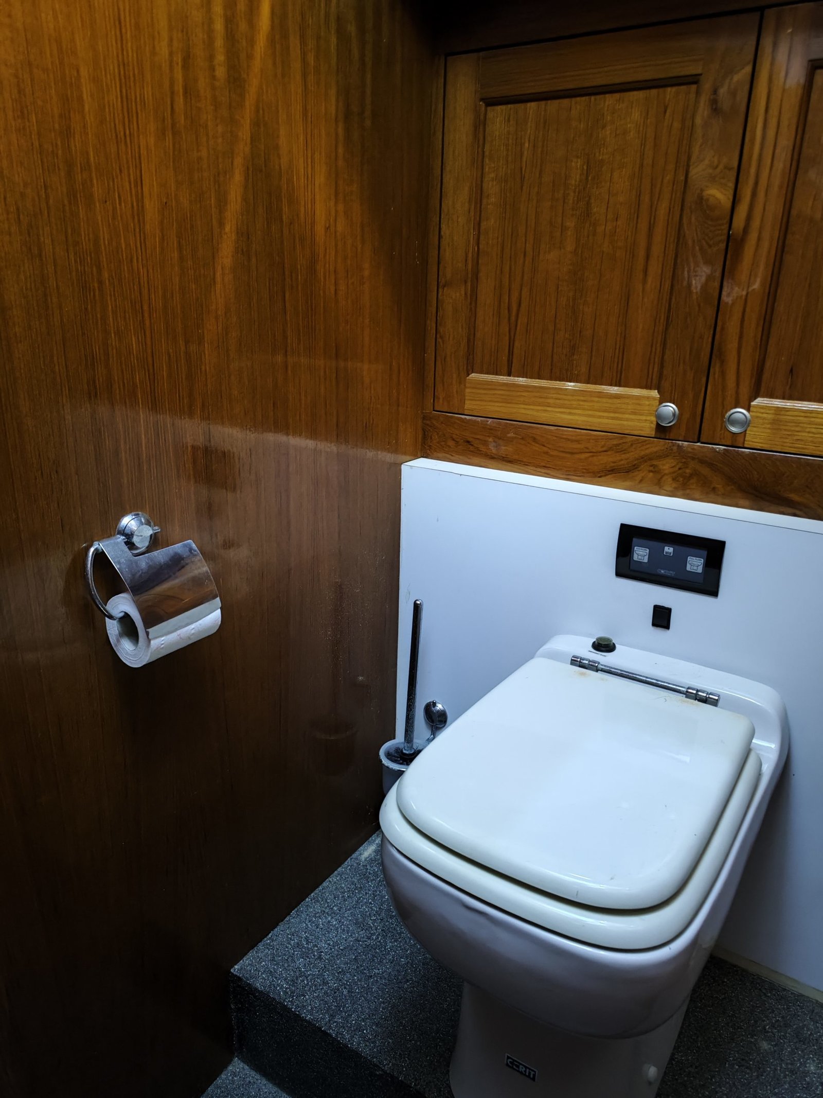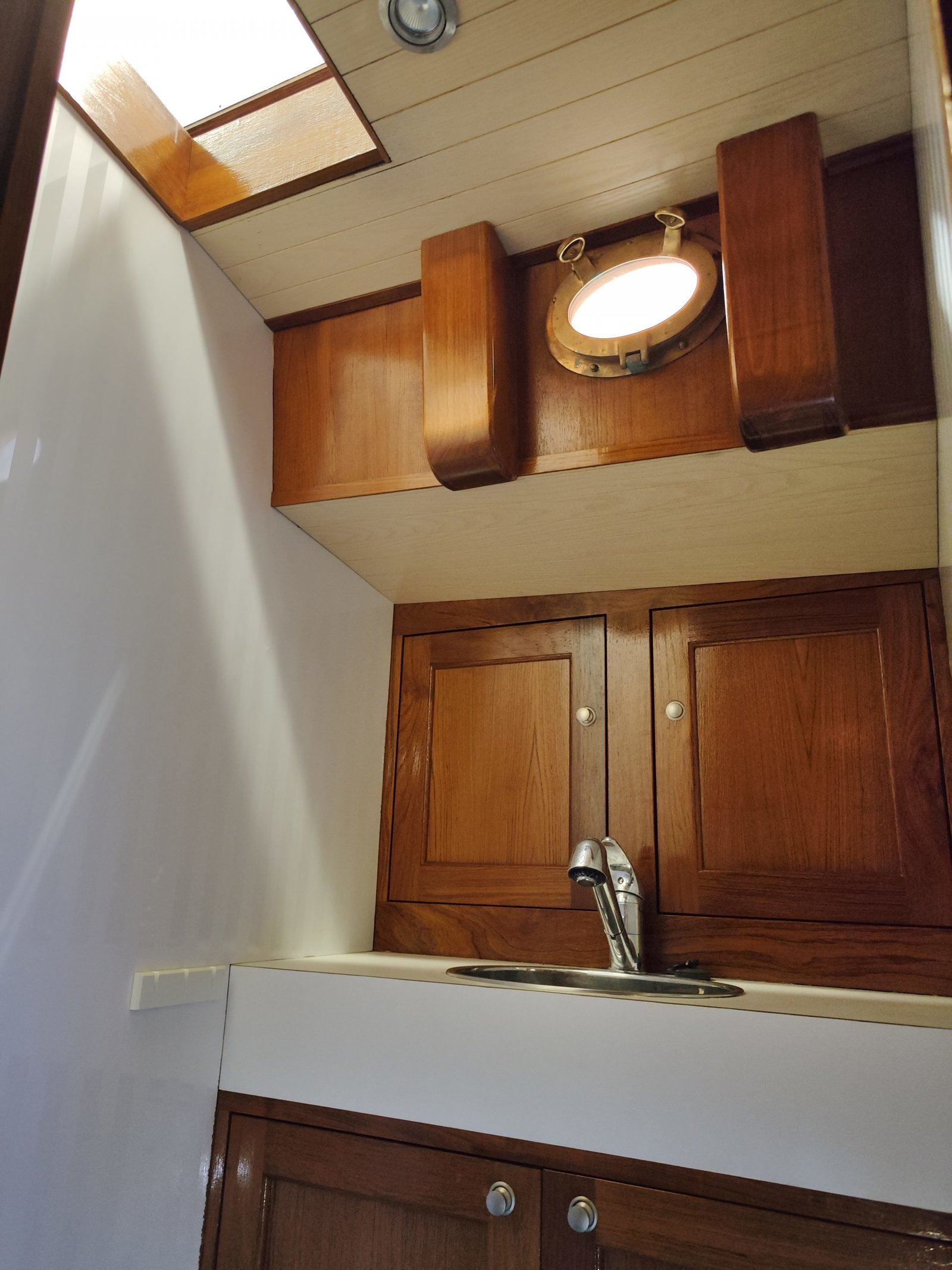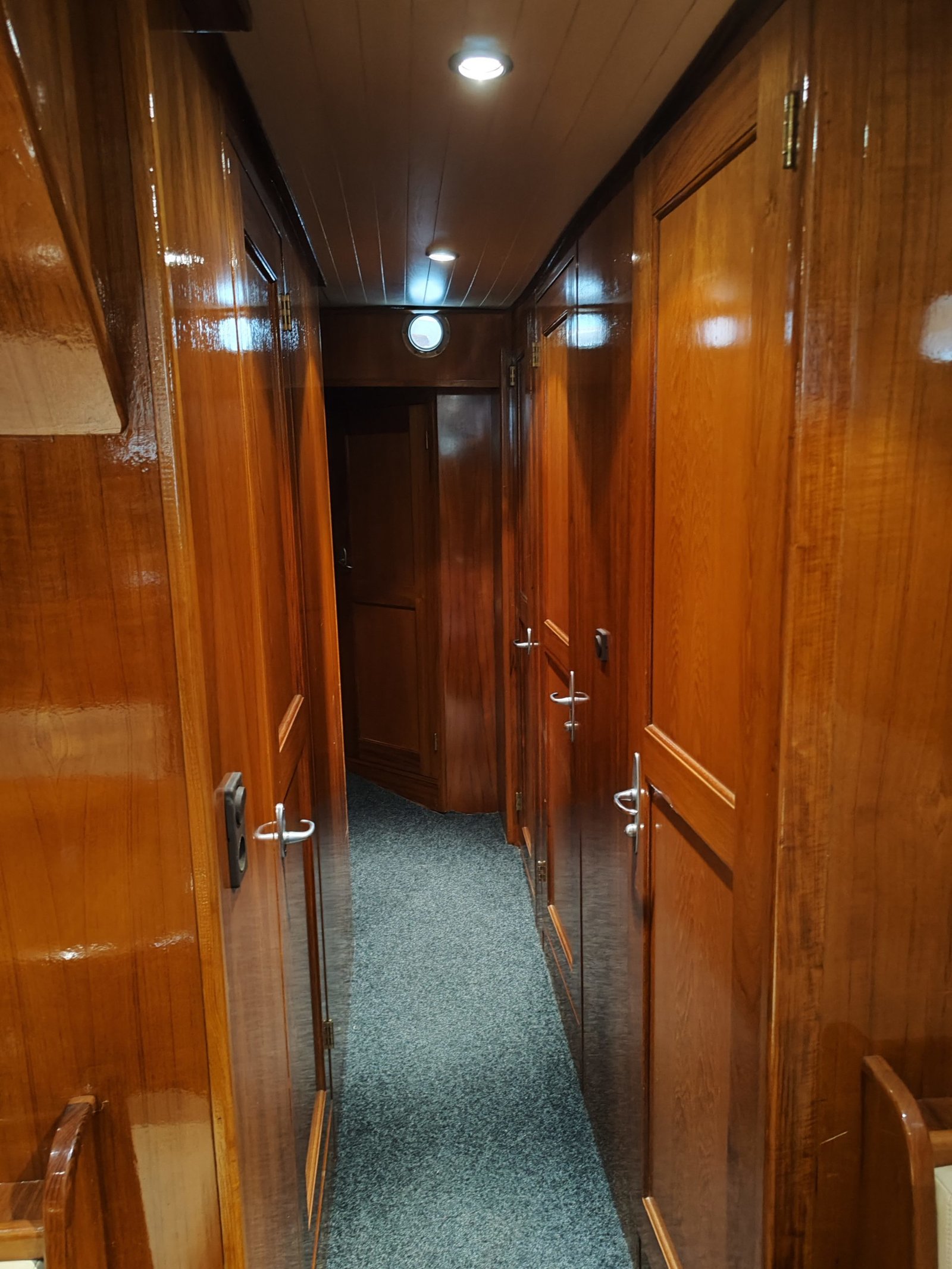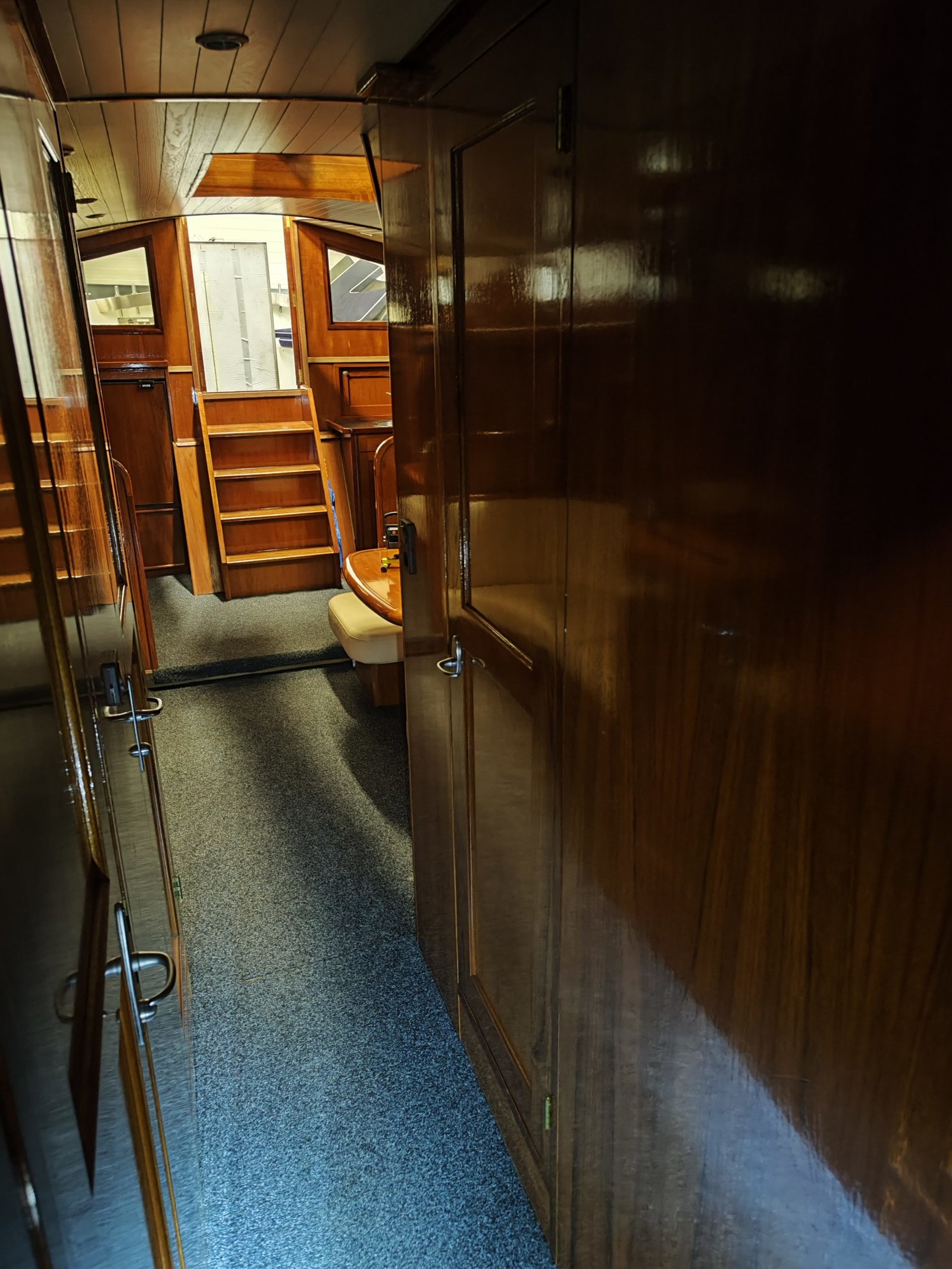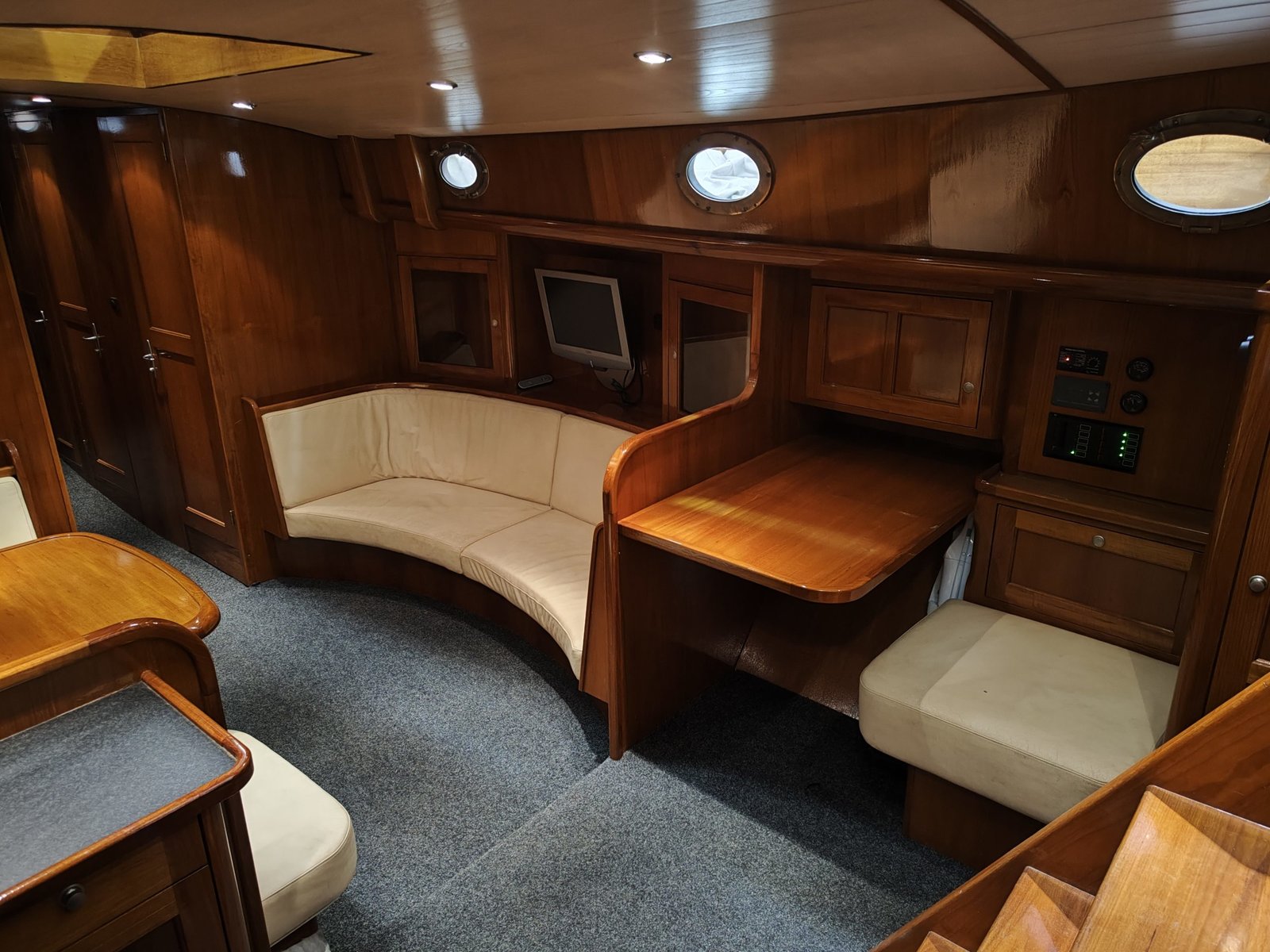 Gezellig interieur met slaapgelegenheid voor max. 6-8 personen, waarvan 4 a 5 slaapplaatsen in de 2 voorste hutten ( eenpersoonsbedden), een dubbelbed in de eigenaarshut. 2 extra bedden te creeren in de zithoek in het salon. De ruime kombuis ligt bij de neergang met ceramisch fornuis en koelkast. Luxe, grote U-bank met tafel.